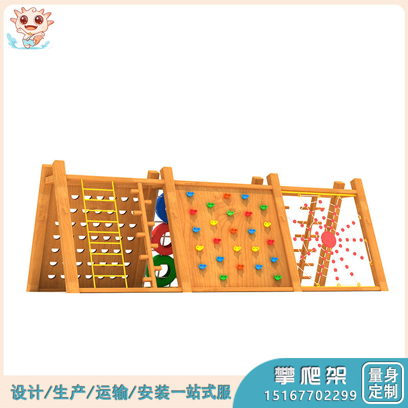 【產品名稱】三角形攀爬架 【產品規格】設計定制 【產品顏色】按情況定顏色 【產品材質】鍍鋅管、不銹鋼螺絲、進口實木 、304不銹鋼、LLDEP環保工程塑料 【產品用途】兒童不僅能鍛煉,也能訓練社交活動,提升游玩的體驗度。 【使用場地】室內兒童游樂場、高端幼兒園、戶外景區、公園項目等 【適用年齡】3歲+ 【運輸安裝】公司會專業進行棉布+軟包的形式進行包裝,保證運輸穩定性;產品到場地后會有專業的安裝師傅對接產品安裝事宜。 【聯系方式】15167702299
