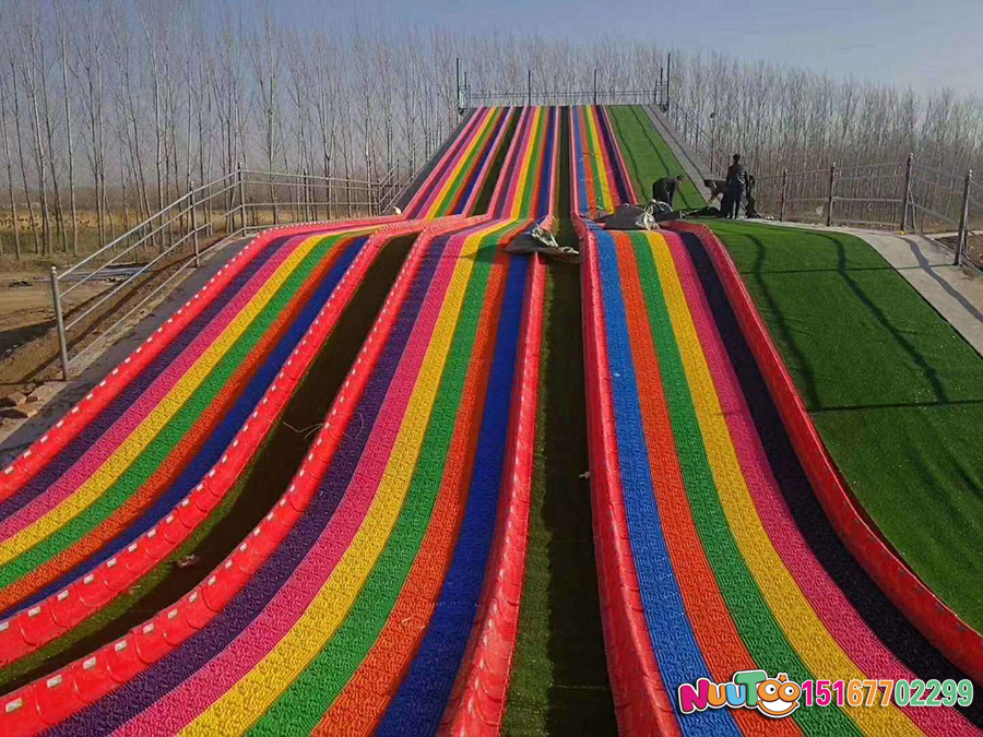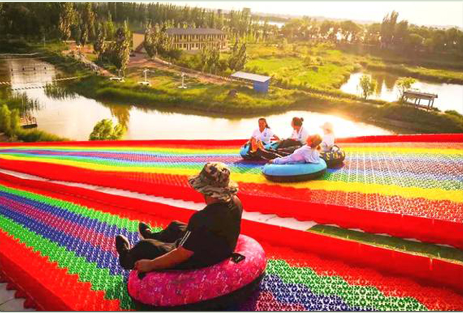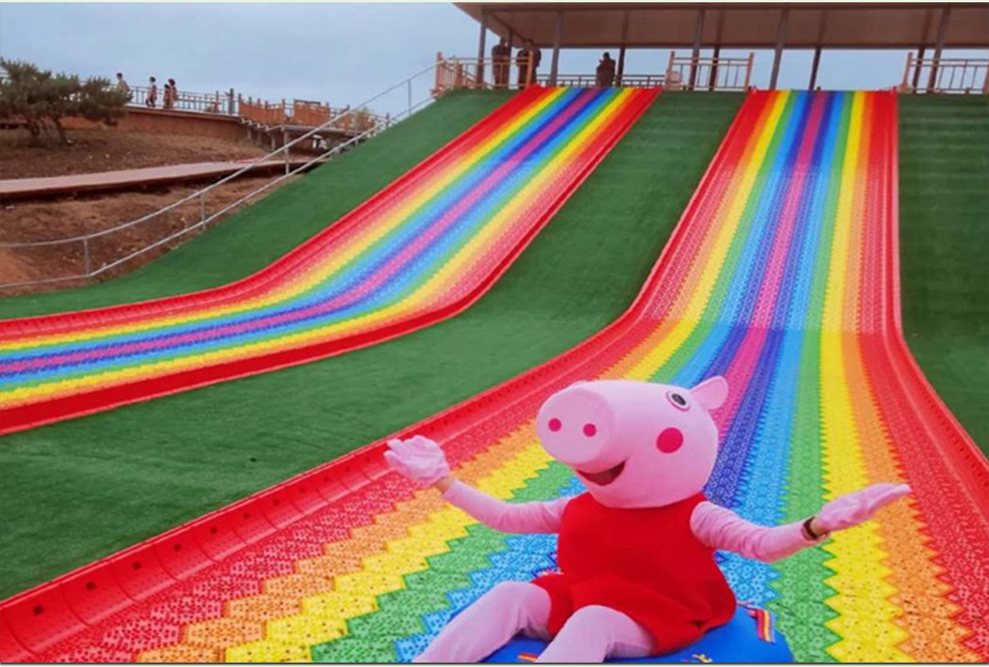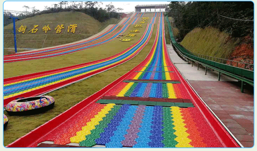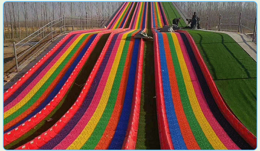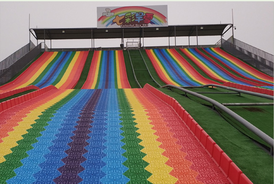 七彩滑梯主要核心部件滑板是采用環保樹脂PE,經一次性注塑工藝成型的模擬滑雪材料。經過實踐與改良,探索出如下圖所示的棒棒糖形狀的旱雪滑板,滑雪板六邊形組合成大型滑道,多色拼搭,遠看就像山間掛著的彩虹,非常吸引觀眾的眼球,遠看就有向往的沖動。